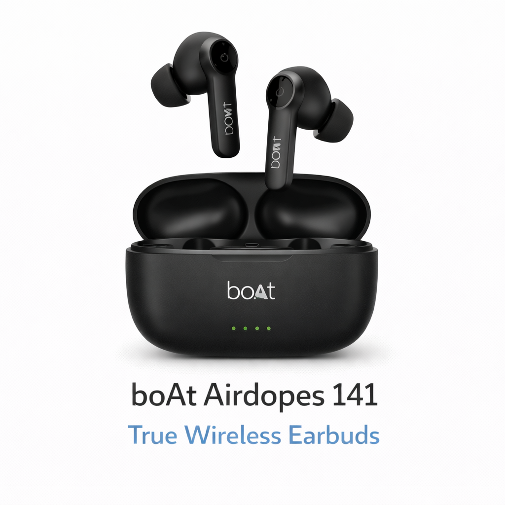 boAt Airdopes 141 offers punchy sound and long playback in a comfortable true-wireless design—great for calls, music, and workouts.